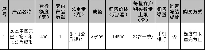 根据中国人民银行贵金属纪念币发行安排,“2025中国乙巳(蛇)年贵金属纪念币”已于近日公告发行,我行根据安排将参与本产品第五批的销售工作。现将有关事项公告如下: