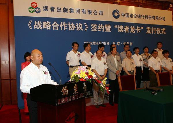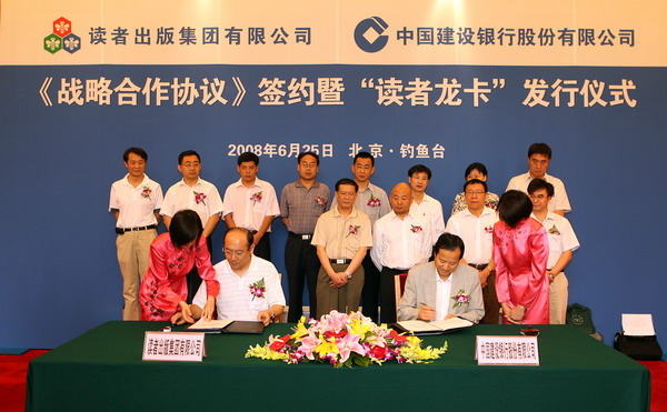 6月25日,中国建设银行与读者出版集团在钓鱼台国宾馆签署《战略合作协议》,并举行“读者龙卡”发行仪式,中国建设银行副行长罗哲夫、陈佐夫、批发业务总监顾京圃,与读者出版集团总经理孟臻、副总经理彭长城等出席。国家新闻出版总署图书司副司长马国仓莅临现场致辞,中宣部新闻出版局副局长刘建生为首张读者龙卡揭幕。甘肃省新闻出版局副局长李玉政也应邀出席仪式。