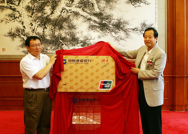 中国建设银行副行长陈佐夫与中宣部新闻出版局副局长刘建生为首张读者龙卡揭幕。