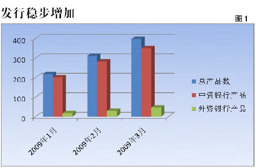 2009年第一季度共发行银行理财产品927款,与2008年第一季度999款的发行数接近,这说明今年第一季度的银行理财市场还是正常的,并不像很多人认为的那样:银行理财市场在2009年举步维艰。2009年第一季度,银行理财市场开始止跌回升,理财产品发行数逐月增加,其中,中外资银行的理财产品发行均稳步增长。(见图1)