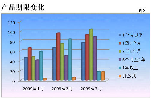 2009 年境内外金融市场的表现仍然让投资者担忧,在经济和金融形势仍然没有清晰复苏迹象的情况下,投资者对于投资的流动性要求仍然较高。这就导致第一季度银行理财产品短期化特征相当明显:1个月以下期限的超短期理财产品的市场占比始终维持在20%,3个月以下期限的短期理财产品占到全部产品的一半左右,1年以下期限的中短期理财产品占整个市场的70%以上。