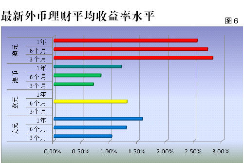 2009年第一季度伊始,因为外币理财产品的投资对象为债券和货币市场,产品收益率与各国基准利率以及伦敦同业拆借利率(LIBOR)紧密联系。所以随着各币种LIBOR利率的不断下降,直接带动了各外币理财产品的收益下行。但随后外币理财产品的平均收益率停止了下滑趋势,其主要原因在于本季度外币理财产品多投资于外币债券市场和货币市场等金融市场工具,与各国基准利率联系紧密,随着各国降息政策的制定实施,其基准利率已经降到历史低点,大幅下跌的可能性较小。目前各期限的澳元理财产品的收益率都较之前有明显上升,这主要是因为澳元以3.25%的基准利率居主流外币之首,比较优势明显。另外,3个月期限的美元理财产品的收益率也较之前有0.2%的提升。(见图6)