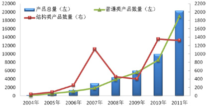 据中国社科院陆家嘴研究基地金融产品中心(下称:“中心”)统计,截止到2011年,全国共发售银行理财产品20270款,同比增长105%,其中普通类产品为18946款(包括55款开放式产品),同比增长122%;结构类产品为1322款,同比下降2%。发售产品的商业银行数量由去年的81家上升为今年的97家。飙升的银行理财产品数量一方面展示出了银行理财产品市场的空前繁荣,另一方面也反映出商业银行由于吃紧的资金压力变相的通过发售银行理财产品来揽储的窘境。相较翻番的普通类产品,结构类产品则是在数量激增的理财市场背景下显得相对冷清。详见图1