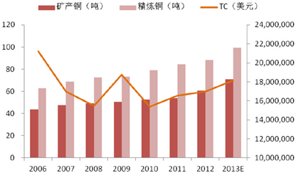 近年随着全球铜矿供给快速增加,且增速明显超过精铜产出,铜粗炼加工费用(TC)开始逐步回升。预计2014年加工费增幅将较显著,全球铜精炼产能利用率有望进一步提高。