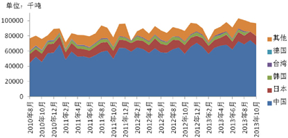 2013年1-10月,全球主要铁矿石进口国的进口总量达93,443万吨,较2012年同期86,598万吨增长7.90%。其中,中国进口铁矿石66,909万吨,同比增长9.91%,全球占比从70.30%提高至71.60%。亚洲另两个需求大国进口增速出现分化:日本同比增长3.42%或376万吨;而韩国同比下降26.59%或1,016万吨。(图6)