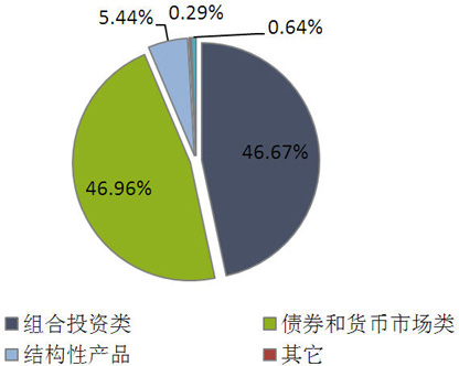 从投向类型来看,债券与货币市场类产品发行了1458款,环比增加87款,市场占比上升2.01个百分点至46.96%;组合投资类产品发行了1449款,环比减少61款,市场占比下降2.84个百分点至46.67%;融资类产品发行了20款,环比增加2款,市场占比上升0.05个百分点至0.64%;结构性产品发行了169款,环比增加28款,市场占比上升0.82个百分点至5.44%;其它类产品发行了9款,环比减少1款,市场占比下降0.04个百分点至0.29%。(图4)