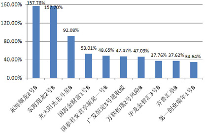 月度收益率进入前十的包括7款混合型产品和3款债券型产品,其中“东海翔龙”2号和3号的劣后级均过了150%。(图12)