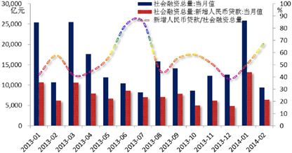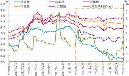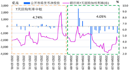 外汇占款方面,美联储3月20日货币政策会议如市场预期的继续削减100亿美元购债规模;会后耶伦讲话表示,将在今年秋季结束购债,6个月后可能开始加息。加息时点较市场预期的提前,使后续新增外汇占款趋势性下降。如果央行没有及时向市场补充流动性,银行间市场流动性总量将减少。而且,二季度信托到期兑付量大、地方政府债务到期量大,以及政府为稳增长继续启动投资刺激项目,企业和地方融资平台公司的资金缺口较大,资金需求十分旺盛,流动性将趋于紧张。如果央行货币政策不适度放松,二季度货币市场利率将易上难下,预计7天回购利率二季度中枢将在4.2%-4.8%。值得关注的时点是4月企业上缴去年全年的所得税、6月末银行半季度业绩考核压力下冲存款。