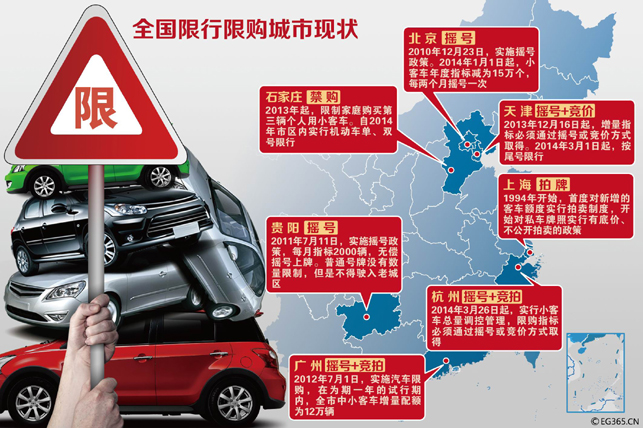 2014年3月25日,杭州实行小客车总量调控管理,采取控制总量和“错峰限行”调整的双重措施。杭州限牌的模式主要参照了广州、天津的做法。杭州市机动车增量指标以12个月为一个配置周期,每个周期配置额度为8万个,按月度分配,并不得跨周期配置。增量指标按照8:2的比例配置,即:每个配置周期内,以摇号方式配置的增量指标为6.4万个,以竞价方式配置的增量指标为1.6万个。另外,从4月14日起北京尾号限行将轮换。图/CFP