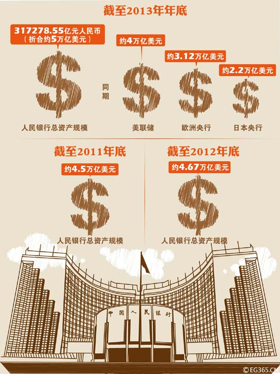 截至2013年年底,人民银行总资产规模为317278.55亿元人民币,折合约5万亿美元;同期美联储资产约为4万亿美元,欧洲央行约为3.12万亿美元,日本央行则约为2.2万亿美元。自2011年以来,中国人民银行资产规模稳居全球央行首位,远超欧美日等央行资产规模。图/CFP