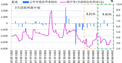 展望后市,二季度中央政府为稳增长继续启动投资刺激项目,地方政府债务到期量大,资金需求旺盛,央行货币政策将可能倾向于中性偏松。如央行4月25日采取定向降准措施,下调县域农村商业银行和农村合作银行存款准备金率各2%和0.5%,释放资金近千亿,有助于稳定货币市场利率预期,降低社会融资成本。同时,央行提前通过短期正回购滚动操作,将公开市场大量到期资金安排在5月,规模达5130亿元,有利于增加市场流动性。