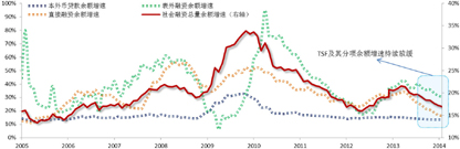 金融:货币和社会融资余额增速均持续放缓。货币增速的回落,一方面与新增外汇占款规模的明显回落有关,另一方面则与银行存款增速的趋势性下降有关。而存款增长乏力的原因主要有二,一是日趋严格的影子银行监管和中性偏紧的货币政策,导致了非标派生存款规模的减少;二是“余额宝”等利率市场化催生的货币市场基金产品,对于银行存款构成了一定分流。