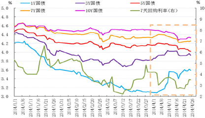 总体上看,5月资金面将较4月有所趋紧,需密切关注国际资金流向是否会因人民币持续贬值和美国退出QE加快而逆转,以及后续还可能出现季节性因素将使资金面阶段性趋紧。如5月企业所得税年度征收,月末金融机构或为向来流动性紧张的6月提前备付资金,可能会使月末资金利率上行。但央行中性偏松的货币政策态度,使市场对资金面宽松的预期增强,同业资金活性上升,在外汇占款没有突然急剧减少的前提下,市场资金面将维持宽松态势。预计7天回购利率5月中枢将在3.4%-3.8%。