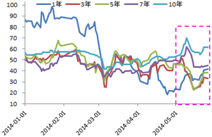 综上所述,资金供给整体增加,而另一方面,随着中国一线城市的楼盘降价促销,房地产市场的降温将使房地产投资增速和购房的资金需求下降。而且由于市场机构普遍吸取去年6月钱荒的教训,对流动性管理今年较为谨慎,这可能将使6月的资金紧张程度低于市场预期。不过,仍需密切关注国际资金流向是否会因人民币持续贬值和美国退出QE加快而逆转,以及季末银行冲存款、地方政府偿债和信托兑付压力带来的资金面阶段性紧张。预计7天回购利率6月中枢将在3.3%-3.8%。