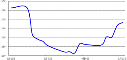 上周,由于伊拉克局势不稳,市场避险情绪升温,带动国际金价上涨,周五收于1276.50美元/盎司,较前一周上涨1.99%。