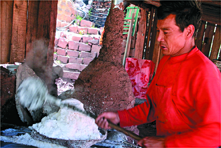 黄桂生家两口热腾腾的熬盐大锅就架在诺邓村口,离古盐井不到50米,特殊的地理位置让他家取卤水显得很方便。诺邓村会熬盐的人家很多,但现在也只有为数不多的人家在做,原因是诺邓村依山而建,很多人家因山路远,坡度大,取卤不便而放弃。