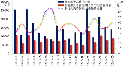 一季度表内信贷融资渠道力度明显不足,原因或在于:(1)存款分流形势加剧下,商业银行贷存比约束增强;(2)市场对于未来央行政策及流动性预期不稳定,银行风险偏好下降,信贷投放较为谨慎;以及(3)政策约束加强、信贷额度紧张等。目前,虽然信贷投放在稳增长政策导向下已经向基建投资定向宽松,但5月份投资到位资金同比增速仍处于历史低位,并且继续低于同期投资增速,显示资金瓶颈依旧是经济增长的巨大障碍,当前投资资金约束的边际好转尚不足以支持投资增长明显好转,而且对经济增长至关重要的房地产业融资来源依然紧张。故而,年内出现有利信贷投放的政策的概率在上升,如贷存比计算口径调整、信贷额度约束适度放松以及定向宽松向房地产业扩围等,此外,经济企稳大背景下银行风险偏好的回升,也将有助于其贷款投放意愿的增加。
