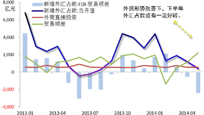 当前跨境资本加速流出的主要原因在于,国内房地产市场低迷,导致海外投资者纷纷看空中国经济增长前景,继而快速撤出跨境资金。展望后期,(1)伴随国内微刺激政策逐步出台、财政支出进度加快、货币宽松预期升温,加之央行近期有意引导人民币贬值压力平复,预计后期跨境资金流入动力或会小幅增强,从而对外汇占款增量产生正面影响;再考虑到(2)外围欧美经济稳步复苏,且政策层重提促进外贸发展的重要性,后期外占环比增量或将在外贸改善的主支撑力作用下趋稳。(图11)