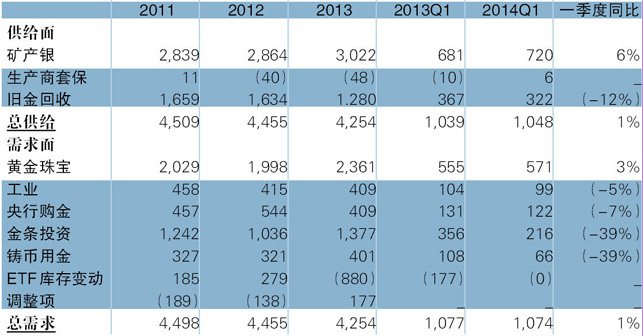 需求方面,2014年第一季度全球黄金需求为1074吨,与2013年同期基本持平。除首饰需求同比上升外,其它需求均出现不同程度的下滑。其中,首饰需求同比增加3%至571吨,主要是中、日和英国的买需较为强劲,中国需求上升10%至203吨,为历史高位,印度受政策限制首饰需求下跌9%至146吨;需求降幅最大的是金条金币的投资需求,同比下降39%至282吨,反映投资者对后市信心不足;央行购金小幅下滑7%至122吨,仍处相对高位;ETF一季度仓位几无变动,一方面说明黄金资产配置需求尚未恢复,另一方面显示资金流出金市迹象暂停,金价大幅下跌的动能减弱。