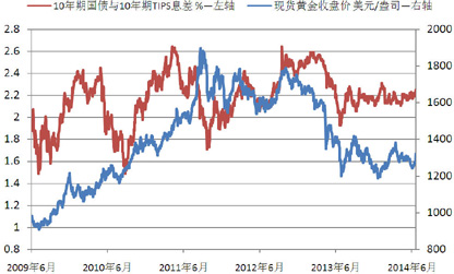 整体来说,下半年支撑金价走强的因素有以下几点:(1)美国通胀走高,支撑金价上行。伴随着美国经济稳健复苏,通胀恐不仅仅是美联储所认为的暂时“噪音”,或将是个持续过程。从近期数据来看,美国10年期国债收益率与同期TIP息差扩大,反映通胀预期升温,金价后市有望得到提振。(图2)。(2)地缘政治冲突难以根治,黄金避险需求犹存。在乌克兰问题上,俄罗斯和西方国家尚未达成一致协议;伊拉克战乱牵扯到宗教冲突,短期难以解决;土耳其、泰国国内局势均不稳定,阿富汗大选前景不明朗等,将凸显黄金的避险需求。(3)印度黄金进口政策有望放松,当前印度的经常账户赤字过高情况已得到好转,一季度经常帐赤字已收窄至12亿美元,同时黄金进口连续3个季度大幅下降,国内黄金产业处境困难,若印度政府放松黄金管制,则黄金实需有望上升;(4)目前金价已充分反映利空因素,未来其对负面消息的敏感性降低。上半年金价经受住重重利空考验:如印度放松进口管制的政策迟迟未至、3月FOMC会后市场误解耶伦言论为提前加息等,但金价在1280美元/盎司附近支撑较强,仅在短期向下跌至1240美元/盎司后又快速反弹至1300一线附近。