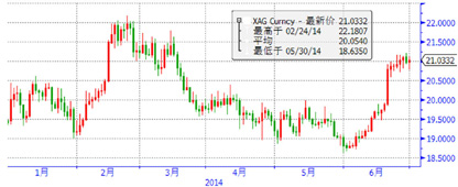 2014年上半年国际白银现货价格开于19.47美元/盎司,收于21.03美元/盎司,最高价22.18美元/盎司,最低价18.64美元/盎司,涨幅8.01%(图5)。国内方面,上海金交所白银T+D开于4030元/千克,收于4272元/千克,最高价4426元/千克,最低价3950元/千克,涨幅6.51%。考虑到上半年人民币兑美元贬值超过2%,国内白银走势明显弱于国际白银。目前,含增值税的国内银价仅比不含税的国际银价高2%。上半年白银走势与黄金基本相同。(图3)