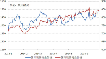2014年上半年,国际现货铂金价格开于1367.45美元/盎司,收于1486.00美元/盎司,累计上涨8.39%;国际现货钯金开于714.20美元/盎司,收于843.75美元/盎司,累计上涨17.78%,其中钯金价格于6月11日触及864美元/盎司,为近10年来高点。(图4)