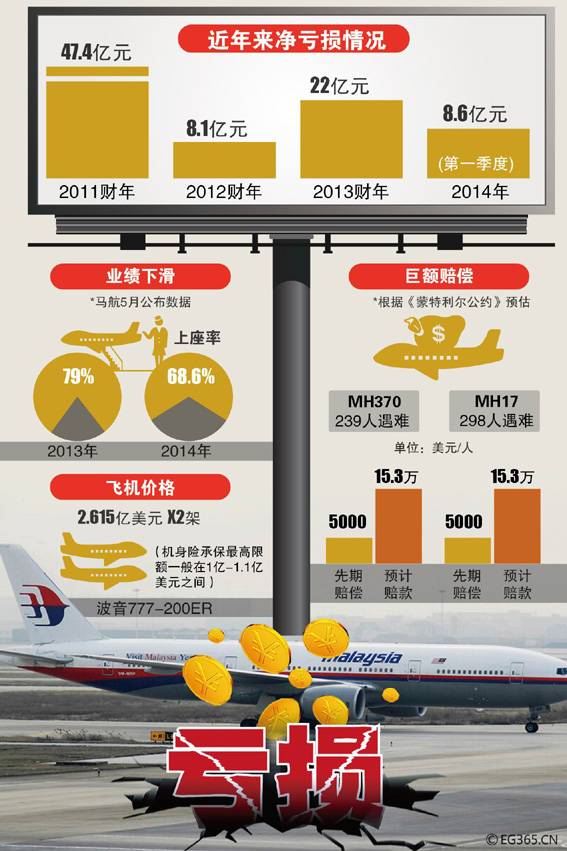4个月内两次空难,让已经连续亏损的马来西亚航空公司成为绝对的悲剧主角。根据《蒙特利尔公约》计算,包括先期赔偿在内,两次空难,马航将支付超过5亿元人民币的损害赔偿。与此同时,马来西亚方面也对外承认,现在要拯救财务状况不断恶化的马航或许为时已晚,不排除马航宣布破产的可能性。图/CFP