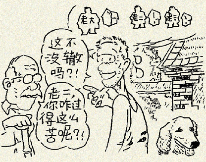 开春了,王二一家开始忙着盖房子。王二盘算,今年把大房子盖好。来年再给大儿子盖房,后年再张罗二儿子的房子,小儿子的房子等到三年后才能轮上了。