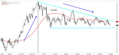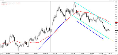 汇率展望:从日线图上可以看出,美元对日元成区间波动走势,但波动区间逐渐收窄,形成三角形态,预计美元对日元将于今年年底前突破形态,并且向上突破的概率较大。这是因为伴随着美国经济复苏态势稳定,美联储将于今年年底结束缩减购债。随着失业率的进一步下降,美联储升息时间亦将再次提上日程,从而支撑美元走高。预计2014年下半年日元的波动区间为【100,106】。(图4)