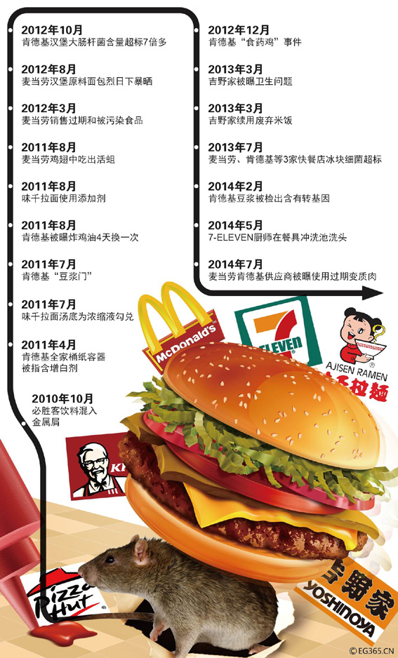 近日,几家国际知名快餐连锁店的肉类供应商上海福喜存在大量采用过期变质肉类原料的行为被曝光。事实上,作为扎根中国市场多年的洋快餐,出现食品安全问题已经不是第一次,不断挑战着国内消费者的脆弱神经。根据公开报道梳理发现,过去的5年里在华洋快餐店已经曝出至少17起食品安全事件。图/CFP