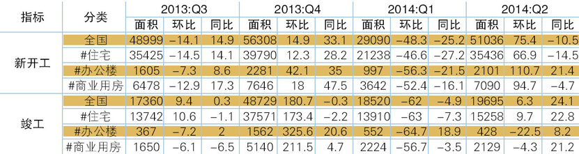 表3 2013年Q3 -2014年Q2房屋建设情况 单位:万平方米,%
