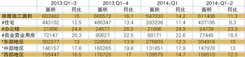 表4 2013-2014年连续四个季度累计房屋施工面积情况 单位:万平方米,%
