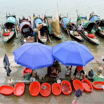 7月19日下午,烈日炎炎,浙江富阳富春江陈家弄亲水平台渔码头,清晨出发打渔的渔船陆陆续续靠上了岸边。这个由九姓渔民自发形成的渔码头规模不大,却是当地人采购一手江鲜的仅有的两、三个鱼市之一。九姓渔民(陈、钱、林、李、袁、孙、叶、许、何)在富春江流域打渔自明代以来已延续了五、六百年,全家吃、住生活都在船上,上世纪七十年代实现上岸定居。目前仍有40余人、20多条船从事捕鱼生产,为居民提供鱼鲜。干铁玲/图文