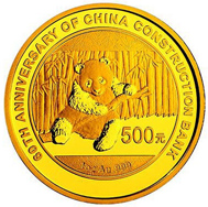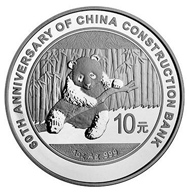 中国人民银行于2014年7月31日发行《中国建设银行成立60周年》熊猫加字金银纪念币,全套3枚,分别为31.104克(1盎司)和7.776克(1/4盎司)圆形金质纪念币和31.104克(1盎司)圆形银质纪念币,背面图案为熊猫嬉戏图,并刊重量和“Au .999”字样,以及“中国建设银行成立60周年纪念”英文字样和面额,发行量依次为22000枚、75000枚和420000枚。此套金银纪念币为中华人民共和国法定货币,由深圳国宝造币有限公司铸造,中国金币总公司总经销。