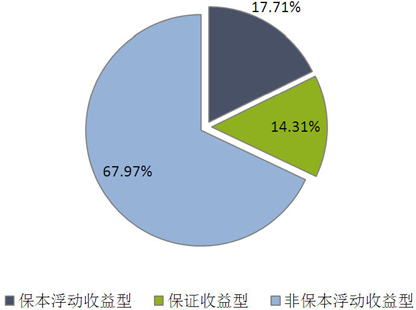 从收益类型来看,保证收益型产品发行719款,环比增加15款,市场占比下降0.04个百分点至14.31%;保本浮动收益型产品发行890款,环比增加47款,市场占比上升0.52个百分点至17.71%;非保本浮动收益型产品发行3415款,环比增加58款,市场占比下降0.48个百分点至67.97%。(图1)