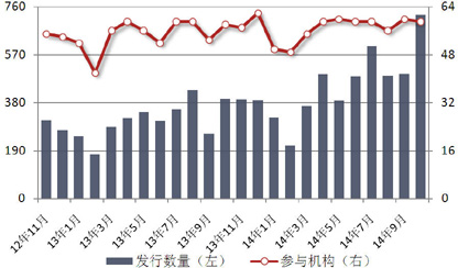 10月受国庆长假影响,银行理财产品发行数量下跌,市场资金面仍保持宽松形势。银行理财产品的收益率与SHIBOR走势较为吻合,短期类型产品的平均预期收益率环比出现上升,中长期类型产品则有所下跌。广东华兴银行酝酿于今年底推出可转让银行理财产品,此次可转让理财产品的交易模式可能包括一口价和竞拍两种形式。未来如果能够增加转让功能,那么银行的理财“资金池”所面临的流动性风险将大大降低;信托产品发行数量激增,主因A股市场走强,证券投资类产品增多。银监会批准全国信托登记中心落户自贸区;非金融企业参与银行间债券市场开闸;证券机构试点发行短期公司债。来自普益财富