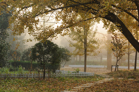 浙江省湖州长兴小浦镇方一村的秋天,金色灿灿,醉人心脾。银杏树上,一把把金色的小扇子有的柠檬黄,有的金黄,有的褐黄,有的黄绿一体,煞是养眼。微风拂过,小扇子又如金色的蝴蝶漫天飞舞,轻轻掉落在泥土上,好似给大地铺上一层金色的毯子。小狗在毯子上嬉戏,鸡鸭驴儿闲庭信步自由觅食,花园般美丽的乡村在晨曦中醒来。掩映在高大银杏树后的民居、接送孩子的校车,一派富裕安逸宁静祥和的景象。中国南方有如此农村景象?游客们是否把眼光收回到这片土地。■ 马茵/图文