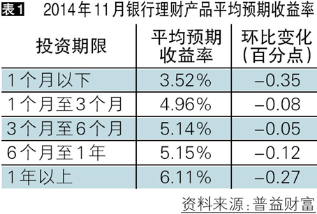 本月银行理财产品收益率整体呈下跌态势。各期限类型银行理财产品的平均预期收益率均有所下跌,其中,1个月以下、1年以上期限类型跌幅较大,分别为0.35和0.27个百分点。此外,本月央行启动新一轮降息也是收益下降一大因素,预计基准利率的下调将继续带动银行理财产品的收益率下调。(表1)