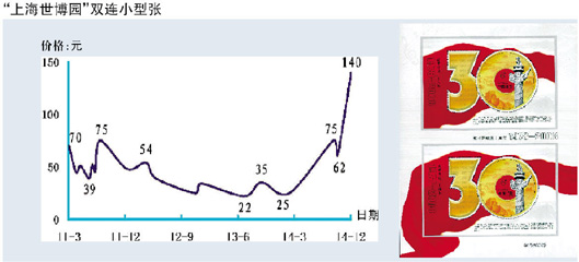 至于挂牌品种的表现就更加令人惊叹,像“中国古镇(1)”小版张价格从年初跌破面值的11元飙升到135元,11倍升幅让人惊叹不已,“金铜佛造像”小版张由年初的14.5元狂涨至75元,涨幅为3.2倍,而2004年发行的“人大”小版张则从20元暴涨到280元,14倍的升幅同样令投资者大跌眼镜,2003年发行的“晋祠彩塑”小版张也从95元攀高至500元,纯涨幅高达4倍余。