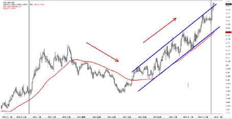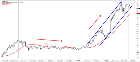 走势回顾:美元对日元本年波动幅度较大,全年上涨13.6%,最高触及121.86。2014年伊始,因极寒天气席卷美国大部分地区,导致非农就业人人数变化等重磅经济数据低于预期,美联储新任主席耶伦讲话态度鸽派,美债收益率连续下跌,与此相对,日本央行维持货币政策稳定,并保持对消费通胀的乐观预期,美元对日元自高位回落,最低至100.75。随后,美元对日元一直呈区间波动行情,波动区间为[100,104],多空力量胶着。在经历了长达数月的窄幅盘整之后,日本央行于9月初首度以负收益率购买公债,突显出其不计任何代价来促通胀的决心。2014年10月底,因需求下滑与油价下跌给物价带来下行压力,日本央行意外扩大基础货币供应至80万亿日元,并且美国经济形势显示强劲复苏态势,两因素共同推动美元对日元一路上行,最高触及121.86的7年高点。