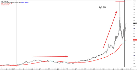 走势回顾:卢布全年来看跌幅明显。年初由于俄罗斯将乌克兰的克里米亚吞并,欧美对俄罗斯实施小幅制裁措施,上半年美元对卢布在【32,36】之间区间震荡。2014年7月,欧盟与美国因俄罗斯与乌克兰的冲突升级对俄罗斯采取经济制裁。以此为触发点,投资者出于对俄罗斯经济前景的担忧,大量卖空卢布,而且国际原油在下半年下跌50%,使卢布展开了长达5个月的贬值行情。11月之后卢布陷入灾难性贬值,12月15日、16日更是出现连续两日暴跌,日间最高触及79.9125的全年最高点。为应对贬值局面,俄罗斯央行分别在10月31日、12月11日和12月16日三次上调基准利率,达到17%的历史高水平。超跌之后的卢布出现反弹,年底美元对卢布降到54附近水平。