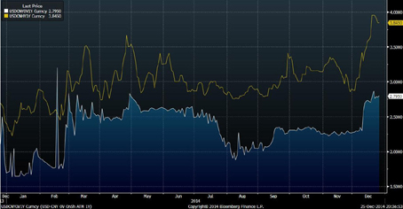 走势回顾:2014年,1年期隐含波动率呈现出N字形上涨走势。在2014年1月之前USDCNY即期重新走上缓慢下跌通道,1年期隐含波动率也缓慢下跌并维持在低位,境内外最低分别只有1.6%和2.3%,但14年2月之后USDCNY即期突然逆转,在大幅上涨的过程中,境内1年隐含波动率也大幅上扬到2.8%; 7月在USDCNY即期从6.26高位下落并重新走上下跌通道之后,1年隐含波动率也快速回落,境内1年隐含波动率也最低跌到过1.7%。随着8月期权外管新政实施带来了大量客户买盘,1年隐含波动率再次进入上涨通道,经历2个月盘整之后, 11月USDCNY开始上涨,大量避险买盘拉动隐含波动率上涨,境内1年隐含波动率达到了2.95%高位。