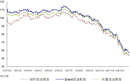 全年各主要原油价格跌幅接近5成,布伦特原油期货自110.9美元/桶跌至57.55美元/桶,跌幅48.1%;WTI原油期货自98.7美元/桶跌至53.71美元/桶,跌幅45.6%;中东阿曼原油期货自107.4美元跌至54.24美元/桶;OPEC一揽子原油指导价自107.94美元/桶下调至54.44美元/桶。