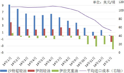 中国被视为此次油价大跌的最大受益国。由于OPEC各国为保障出口份额,大幅下调了出口定价升水——特别是对亚洲地区的出口价。据观察,2015年1月份沙特、伊朗、伊拉克向亚洲出口原油的升水较2014年同期分别减少了9、5.76、4.8美元/桶,因此我国原油进口成本价的降幅较原油期货价格降幅更甚。