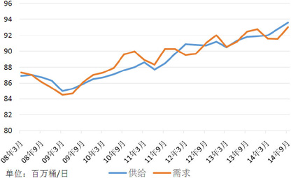 需求方面,鉴于美国经济复苏势头较强,中国经济逐渐适应“新常态”,启动微刺激政策,低油价也有助于激发能源、化工消费,我们认为未来数个季度原油需求将保持2014年下半年的增长势头,2015年全球原油需求将达到9300-9350万桶/日水平。