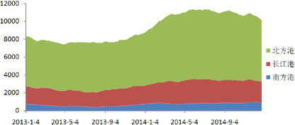 自2013年二、三季度降至阶段性低位后,国内港口铁矿石库存量就持续增加,2014年春节后首周便突破亿吨。根据钢之家(Steelhome China)的统计,7月4日当周的港口铁矿石港口库存达到创纪录的11,360万吨(不含印度矿125万吨)。虽然下半年港口库存量有所下降,但仍始终保持在亿吨以上的高位。截至2014年12月26日当周,港口铁矿石库存总量达到10,155万吨(不含印度矿125万吨),分别集中在北方港口6,895万吨,长江港口2,335万吨,以及南方港口925万吨。