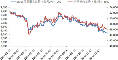 2014年伦铜市场开于7389.5美元/吨,年末收于6284.25美元/吨,最高价7460美元/吨,最低价6230.75美元/吨,下跌14.96%。沪铜走势大体与之一致,开于52290元/吨,收于45800元/吨,最高价52770元/吨,最低价43690元/吨,下跌12.41%。