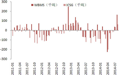 2014年铜市场没有出现年初预计的供给过剩情况,供需存在小幅缺口。根据国际铜业研究组织(ICSG)的数据,前9个月供给缺口为48.5万吨,去年同期为供给过剩11.6万吨。精炼铜供需下半年开始转向过剩,预计在中国需求增速下滑的背景下,全年缺口有望进一步缩小。