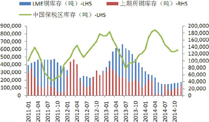 据路透社报道,国储局在3月和4月收储至少20万吨保税区仓库中的进口铜。因此2014年前11个月虽然累计进口327.4万吨,同比增加13.17%,但其中部分进口可能并未进入实体经济消费,精炼铜市场存在部分虚增需求。