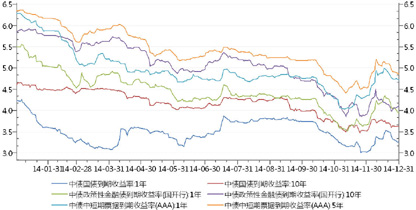 图1 2014年银行间国债、政策性金融债、中短期票据走势
